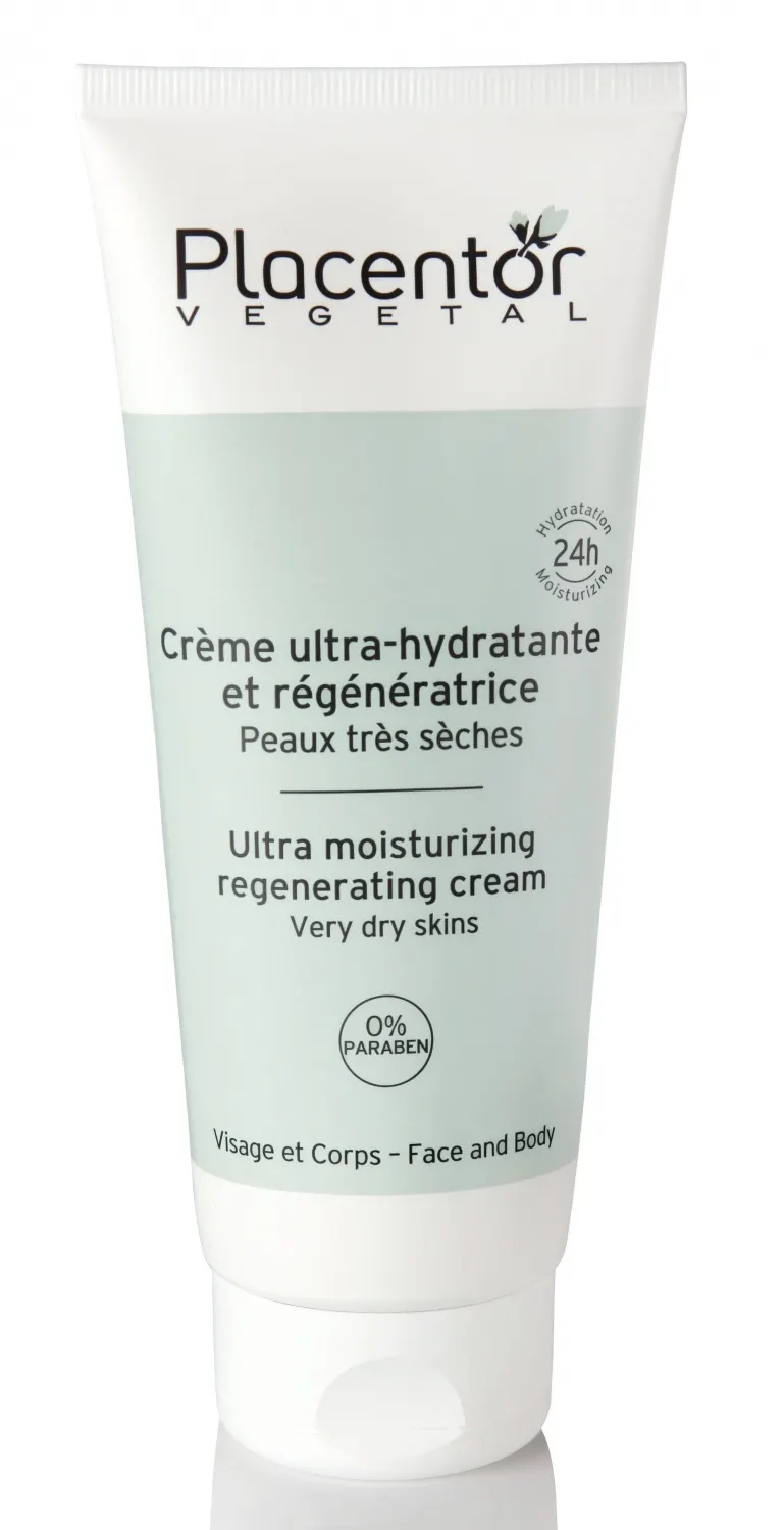 The bold label prominently displays the brand name Placento, along with its dual-language description: "Ultra moisturizing regenerating cream" and "Crème ultra-hydratante et régénératrice." This ensures that users can easily understand its benefits. With a commitment to clean beauty, Placento Vegetal is formulated with 0% Paraben, making it an excellent choice for consumers seeking safe skincare options.