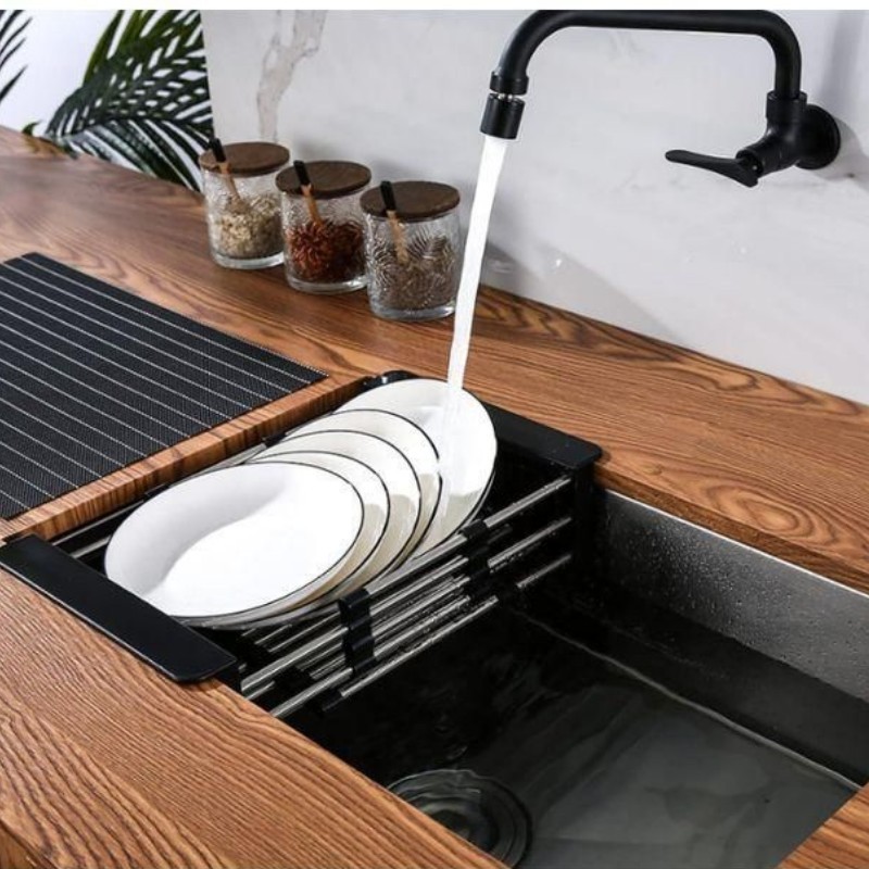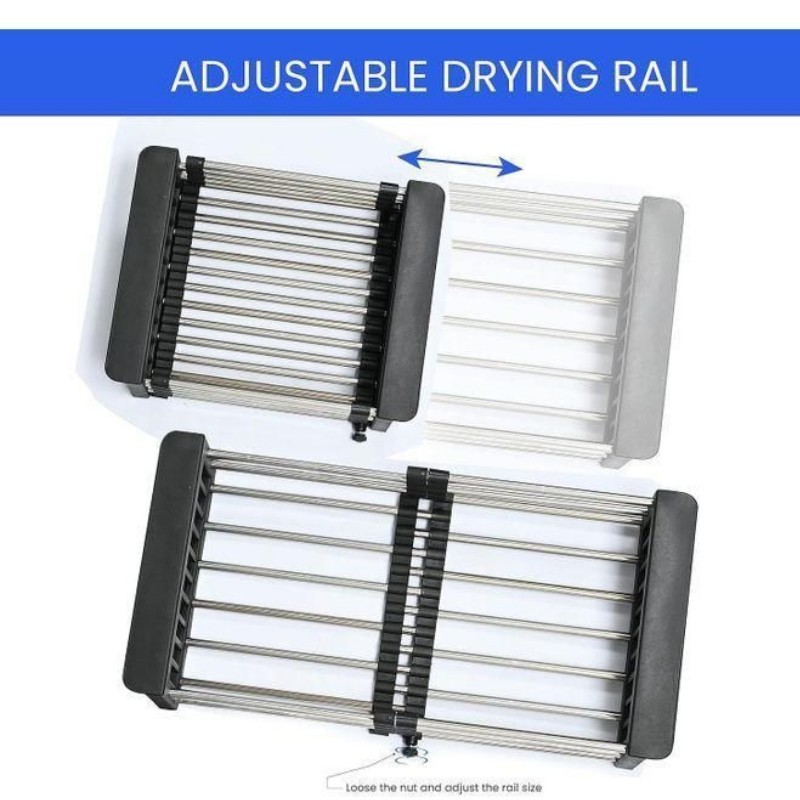 A versatile, adjustable over-sink dish rack perfect for drying dishes and washing produce.